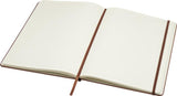 A5 notebook with 70% recycled pre-consumer leather and 30% latex PU cover. Casebound. 192 lined pages recycled paper (96 sheets). Matching cotton elastic closure strap and pen holder.