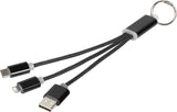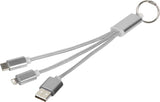 Metal 3-in-1 Charging Cable with Key-ring. The Metal 3-in-1 Charging Cable with Key-ring features a 1 type C, 1 USB type A and a 2-in-1 dual compatible tip for both Apple iOS and Android devices. Comes with a key chain. To charge Apple devices put the cable with the side that has no pins in the device and to charge Android devices put the cable with the side that has pins in the device. . Aluminium.