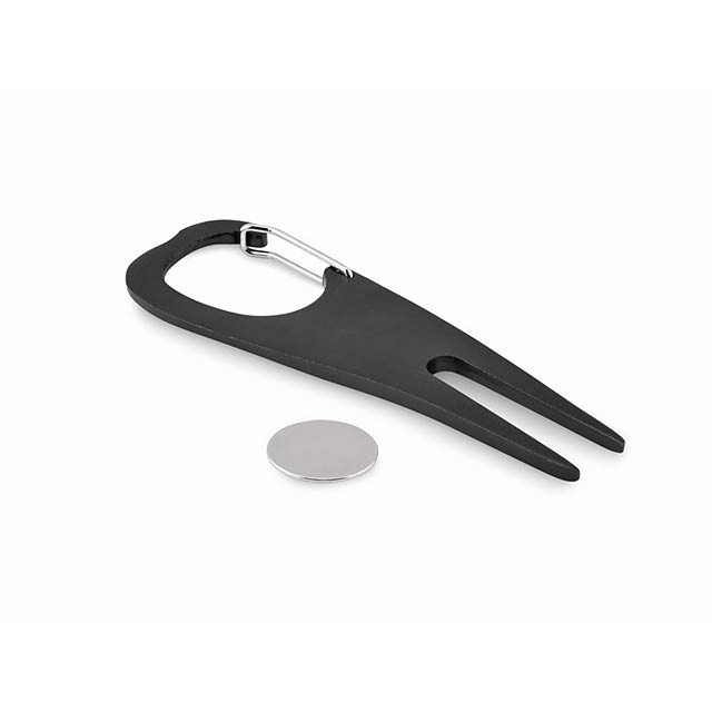 Aluminum golf ball divot. Includes magnetic, removable ball marker.