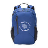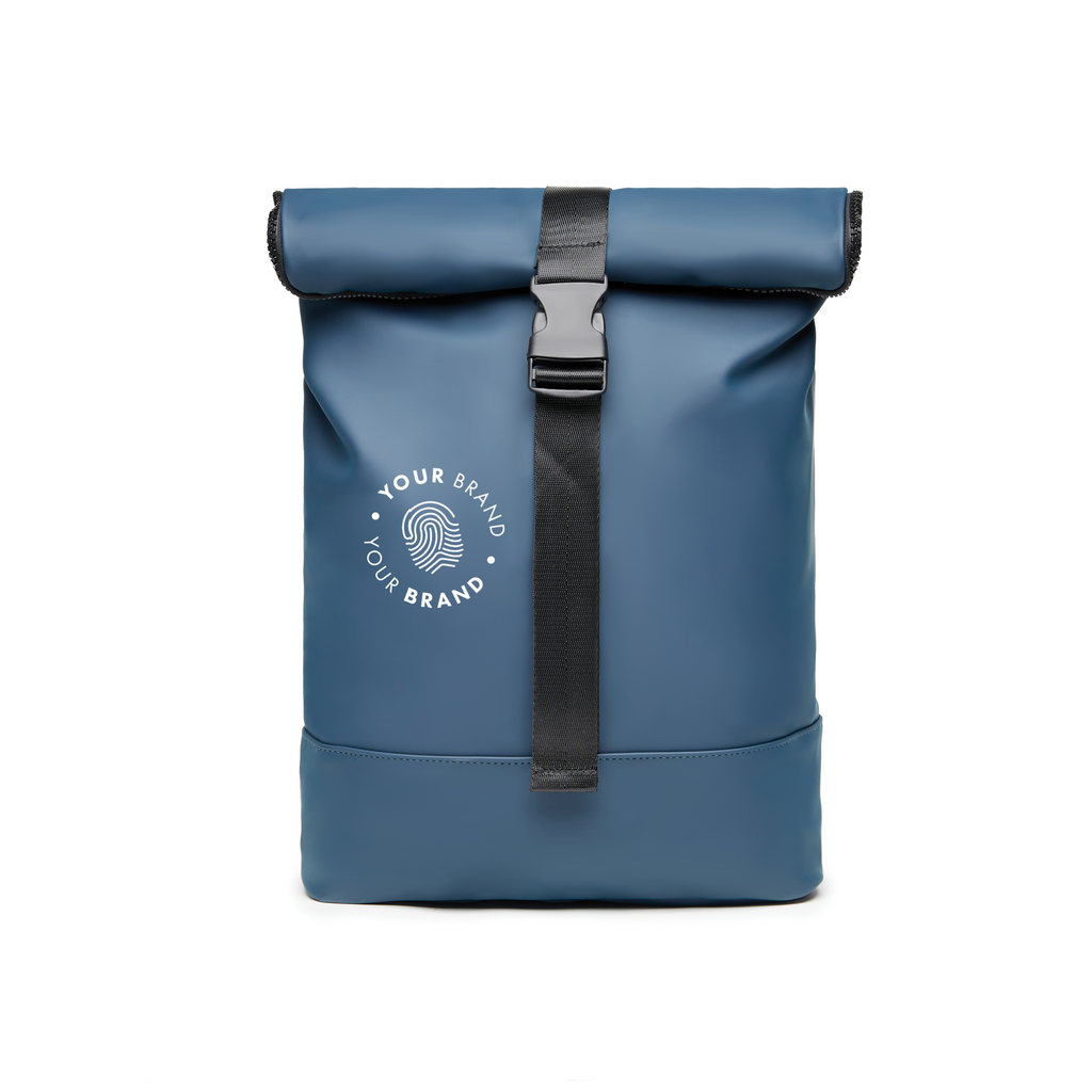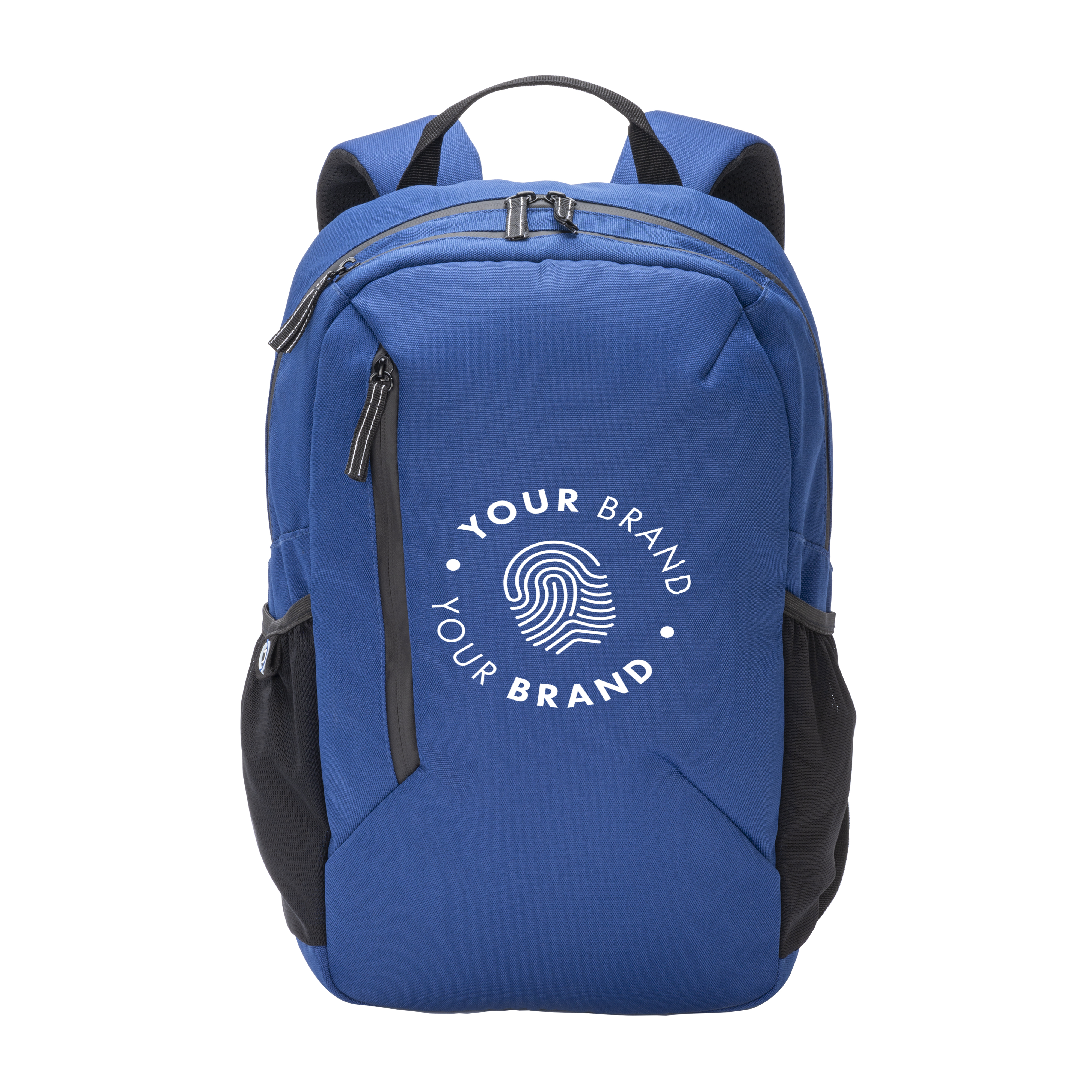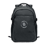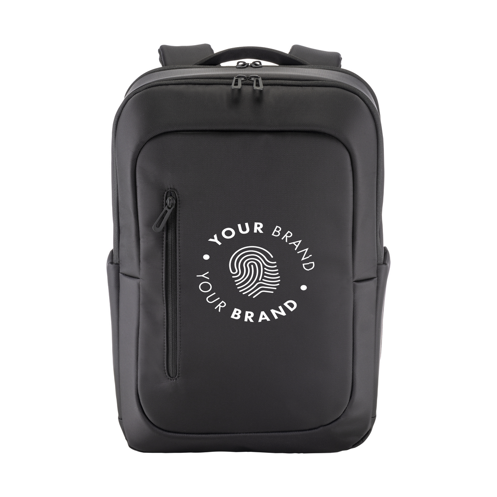 Slim backpack in 600D RPET polyester and 210D lining. Has 15 inch laptop compartment, a 10 inch tablet outside zippered pocket, 2 internal pockets, 2 internal pen pockets, zippered front pocket. 2 side pockets. Soft padded back and adjustable shoulder straps. Suitcase sleeve.