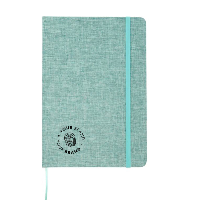 A5 notebook with hard 600D RPET cover. Casebound. 160 lined recycled paper pages (80 sheets). Matching elastic closure strap and ribbon bookmark.