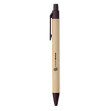 Push button paper barrel ball pen with parts made of 40% coffee husk and 60% ABS. Blue ink.