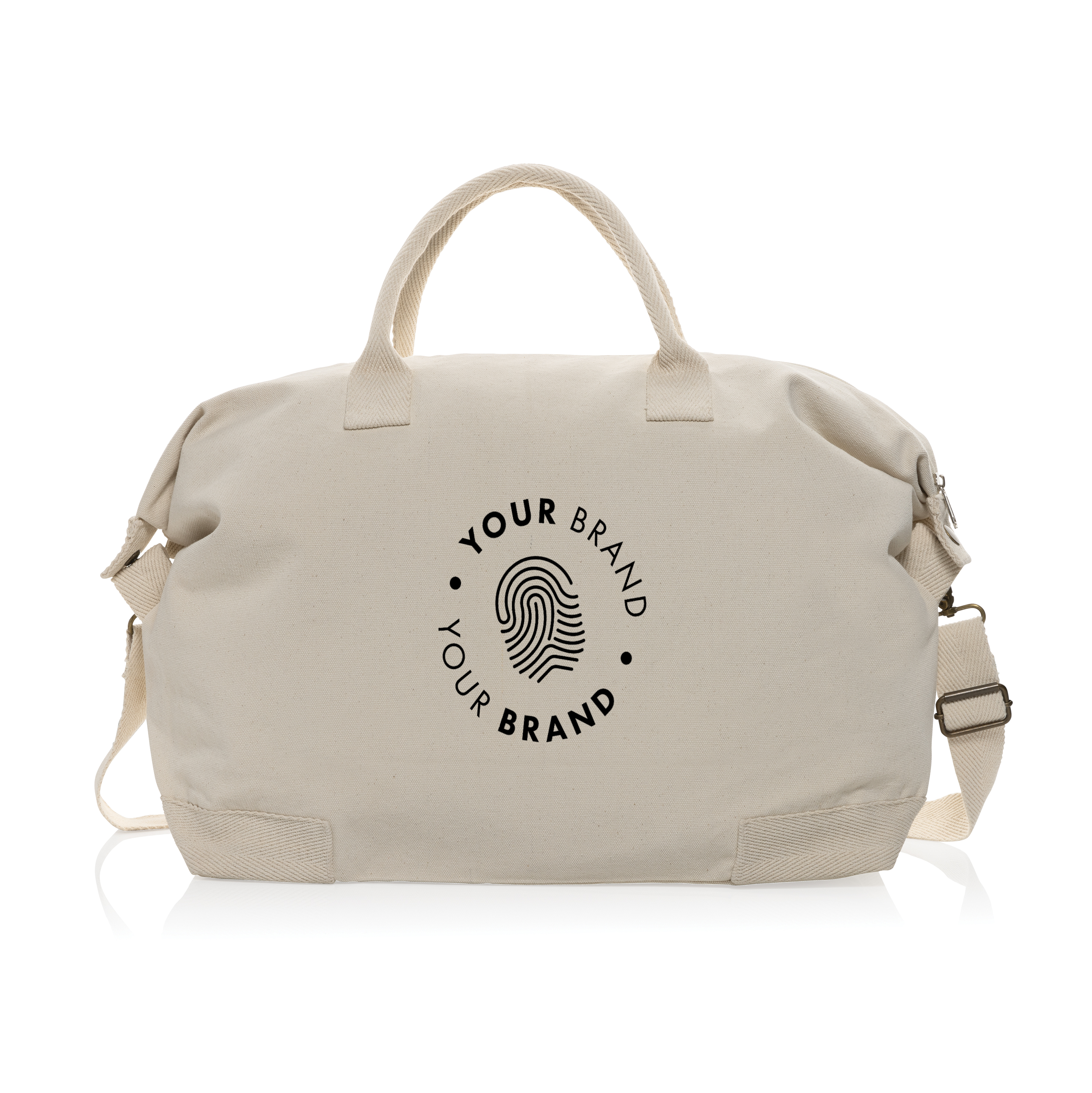 Bicolour cotton navy duffle bag with white stripe. 200gr/m² cotton twill.