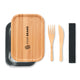 Stainless Steel lunch box with bamboo lid and 2 cutlery utensils with attachable polyester band.