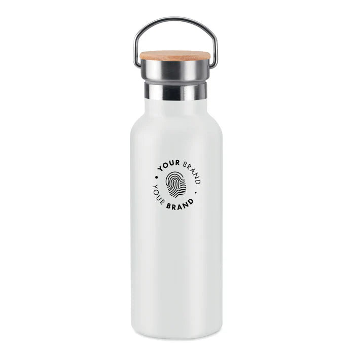 This metal bottle is a double wall stainless steel powder coated vacuum flask with silicone grip for easy carry. The lid is bamboo and there is a carry handle. The bottle is leak free.