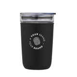Glass tumbler protected by a recycled plastic case. The tumbler is made from 100% durable borosilicate glass.