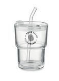 Glass tumbler with lid including removable glass straw. Straw socket and direct drink opening leak-free lid.