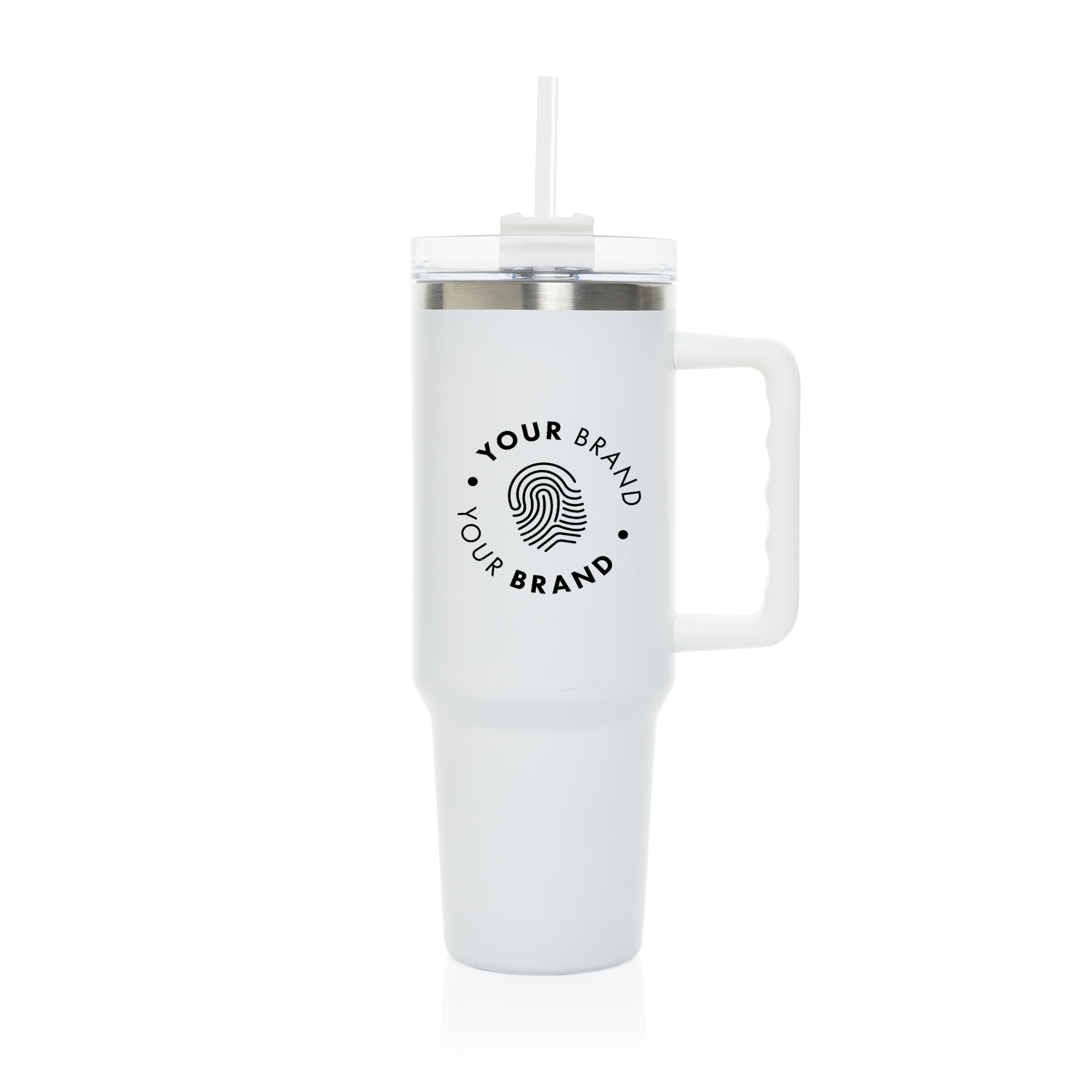 The ultimate 1200ml tumbler designed for those who need a little extra. Its comfort-grip handle and slim base make it easy to carry and fit into most cup holders, keeping you hydrated on the go. Outside made from durable recycled stainless steel, it’s double-walled, vacuum-insulated body keeps drinks at the perfect temperature. It features a spill-proof lid with a dual function for sipping or using the included recycled plastic straw.