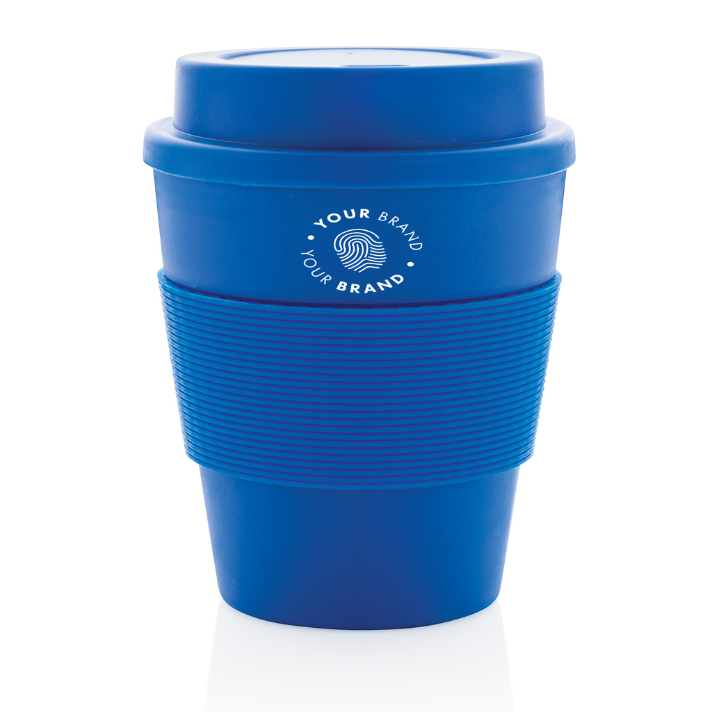 These lightweight and durable cups are perfectly suited to take your coffee on the go. These cups are reusable and made of 100% recyclable friendly PP material. The cups have a screw lid and a silicone sleeve. Dishwasher and microwave safe.